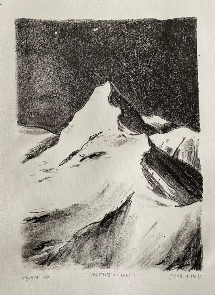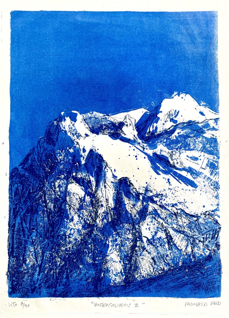 Det er en spennende og tidkrevende trykkeprosess, ofte med “ulykker” eller i beste fall uventede hendelser. På Fellesverkstedet Myren Grafikk (FMG), har jeg fått anledning til å lære dette fascinerende håndverket av dyktige kunstnere, og jeg trykker alle bildene mine selv på litopressen her.